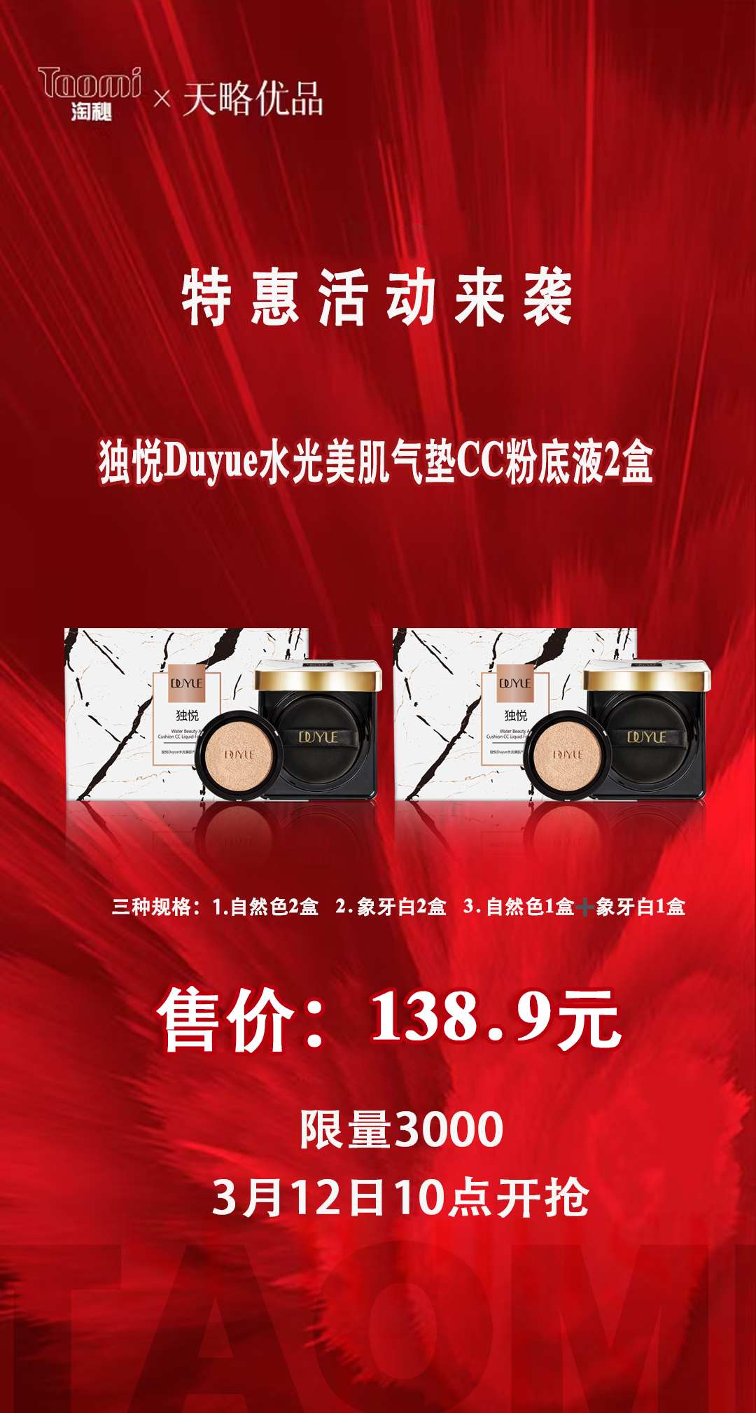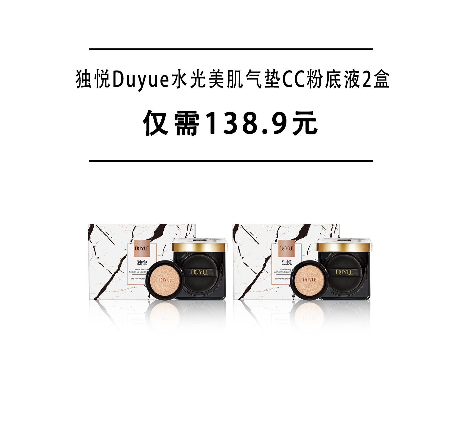 独悦Duyue水光美肌气垫CC粉底液2盒 商品简介:气垫2盒 ¥138.90优惠价