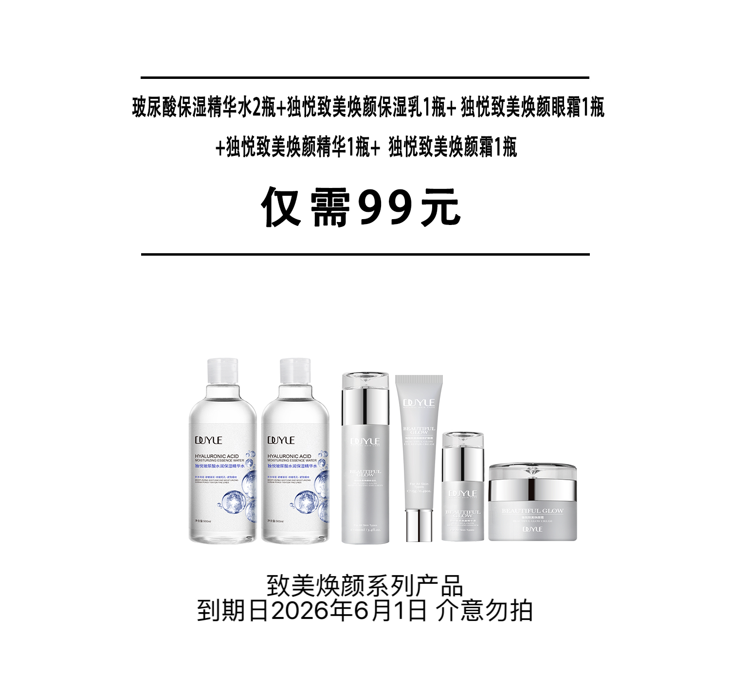 玻尿酸保湿精华水2瓶+独悦致美乳1瓶、眼霜1瓶、精华1瓶、霜1瓶
